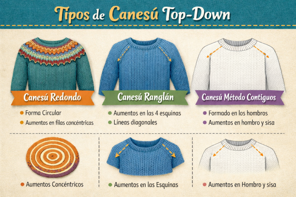 Para la tejedora racional, entender el canesú es el paso definitivo para dejar de «seguir una receta» y empezar a «entender la fórmula». En este artículo técnico, analizaremos las tres arquitecturas principales y cómo elegir la adecuada según el hilado y la morfología del cuerpo.